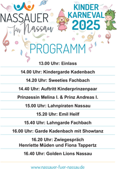 Der eingetragene Verein „Nassauer für Nassau“ richtet am Samstag, den 15.02.2025 nun zum vierten Mal den Kinderkarneval in der Stadthalle Nassau (Einlass ab 13 Uhr) aus und wir freuen uns sehr darüber, dass das Interesse daran immer noch ungebrochen ist. Wenn man was für die Kleinsten tun kann, ist es doch einfach am schönsten. Und deshalb brauchen wir genau Sie! Und nicht nur bezüglich des Kinderkarnevals, sondern auch ganz grundlegend - für den Verein.