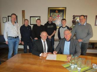 Neuwieds OB Jan Einig (vorne links) und Uwe Bruchhäuser, Bürgermeister der VG Bad Ems-Nassau, (vorne rechts) unterzeichnen den Kooperationsvertrag für die IT-Ausbildung im Beisein der IT-Ausbildungskoordinatoren Stefan Merz (hinten rechts) und Michael Buchheim (2. von links) sowie Neuwieds IT-Amtsleiter Gerhard Wingender und beteiligter Azubis. Foto: Melanie Lange / Stadt Neuwied