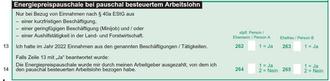 Arbeitnehmerinnen und Arbeitnehmer, denen die EPP I nicht mit dem Arbeitslohn ausgezahlt wurde, erhalten diese über die Abgabe einer Einkommensteuererklärung für das Jahr 2022. Das Finanzamt prüft die Anspruchsberechtigung anhand der Angaben in der Einkommensteuererklärung. Arbeitnehmerinnen und Arbeitnehmer, die ausschließlich pauschal besteuerten Arbeitslohn bezogen und darüber hinaus keine weiteren anspruchsberechtigten Einkünfte erzielt haben, müssen zum Erhalt der EPP I auf der Anlage Sonstiges folgende Eintragungen vornehmen: