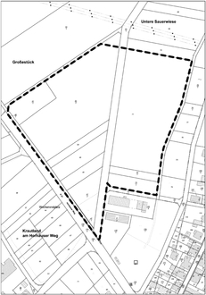 Der vorgesehene Geltungsbereich des Bebauungsplanentwurfes ist in der nachstehenden, unmaßstäblichen Skizze mit einer dicken, schwarzen, gestrichelten Linie dargestellt.