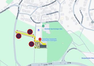 Um im Einsatzfall ein sicheres und schnelles Ausrücken der Feuerwehrkräfte zu gewährleisten, wurde entlang der Zufahrt von der K 31 in Richtung Gerätehaus und Sportanlage beidseitig ein absolutes Halteverbot angeordnet. Auch die direkte Zufahrt zum Gerätehaus ist ab sofort für parkende Fahrzeuge gesperrt.