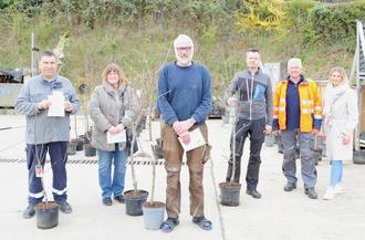 Freuten sich über ihren Geburtstagsbaum: vier der am Gründonnerstag zahlreich im Bauhof erschienenen Jubilare (rechts im Bild: Peter Fleck (Bauhofleitung) und Melanie Klan (Forstverwaltung))...