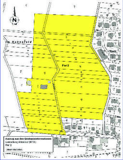 Das angedachte Umlegungsgebiet „Am Hahnsfeld II“ ist im nachfolgenden Auszug aus den Geobasisinformationen kenntlich gemacht.