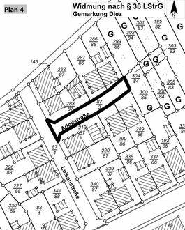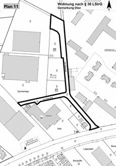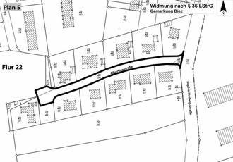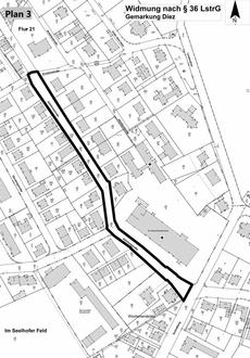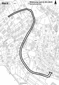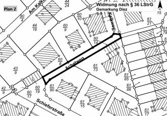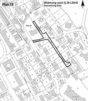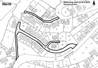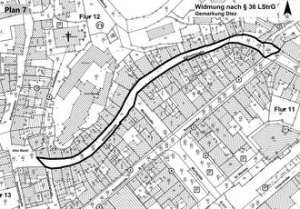 Die Widmung und die Lagepläne können während der Öffnungszeiten bei der Verbandsgemeindeverwaltung Diez, Louise-Seher-Straße 1, 3. Stock, Zimmer D 03, 65582 Diez, eingesehen werden.