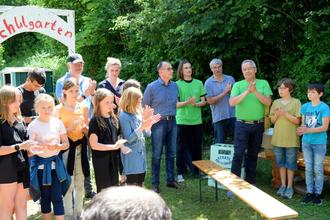 Der für das Projekt verantwortlich zeichnende Oberstudienrat Martin Gürth hatte am Freitag, dem 24. Juni, zur offiziellen Einweihung eingeladen, und zahlreiche Schülerinnen, Schüler, Elternvertreter, Lehrerinnen und Lehrer sowie weitere Gäste feierten am Freitagmittag die Fertigstellung und Einweihung. Auch der Bürgermeister der Verbandsgemeinde Diez und zugleich Vorsitzende der LEADER-Aktionsgruppe Lahn-Taunus war gerne zur offiziellen Feierstunde erschienen: „Hier ist ein kleines, aber sehr schönes und vor allem sehr nachhaltiges Projekt umgesetzt worden, das die Lokale Aktionsgruppe der LEADER Region Lahn-Taunus sehr gerne begleitet hat. Als sogenanntes ehrenamtliches Bürgerprojekt hat das `grüne Klassenzimmer´ die höchstmögliche Förderung zugesprochen bekommen, und als ehemaliger Schüler des Diezer Gymnasiums freue ich mich ganz besonders über eine so gut gelungene Maßnahme an `meiner´ alten Schule. Die gemeinschaftliche Umsetzung mit Schülerinnen und Schülern, dem Schulelternbeirat, dem Lehrerkollegium sowie Monika Schneider vom Kräutergarten Nonnenpfad und Ernfried Groh vom Verein Blühende Lebensräume Diez e.V. ist ein Musterbeispiel für ein erfolgreiches Zusammenwirken!“
