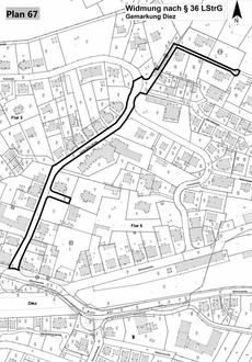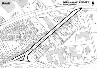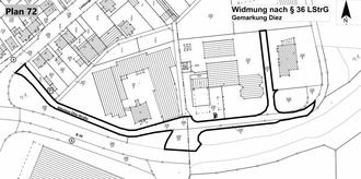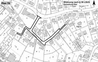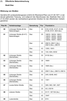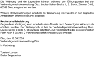 Die Widmung und die Lagepläne können während der Öffnungszeiten bei der Verbandsgemeindeverwaltung Diez, Louise-Seher-Straße 1, 3. Stock, Zimmer D 03, 65582 Diez, eingesehen werden.