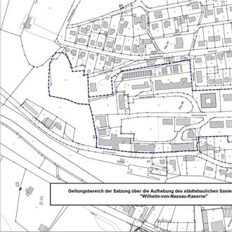 Die Satzung der Stadt Diez über die förmliche Festlegung des städtebaulichen Sanierungsgebietes „Wilhelm-von-Nassau-Kaserne“ vom 06.09.1995, beschlossen am 30.03.1995 und öffentlich bekannt gemacht am 13.09.1995, wird aufgehoben. Der hier aufgehobene Geltungsbereich der Sanierungssatzung ist im anliegenden Lageplan dargestellt.