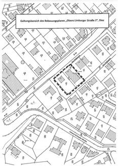 Der Stadtrat der Stadt Diez hat in seiner Sitzung am 31.03.2022 die Aufstellung des o. g. Bebauungsplanes beschlossen. Mit der Aufstellung des Bebauungsplanes sollen die bauplanungsrechtlichen Voraussetzungen zur Errichtung von zwei Mehrfamilienwohnhäusern geschaffen werden. Der Geltungsbereich des Bebauungsplanes ist in der nachstehenden, unmaßstäblichen Skizze mit einer dicken, schwarzen, gestrichelten Linie dargestellt.