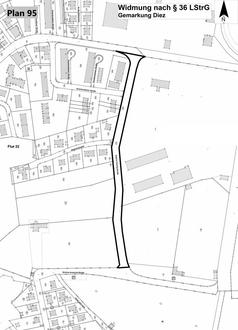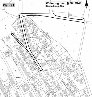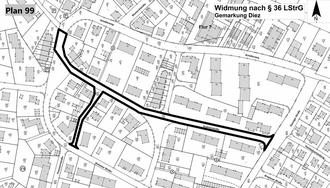 Gemäß § 36 Landesstraßengesetz (LStrG) für Rheinland-Pfalz vom 01.08.1977, in der derzeit geltenden Fassung, und aufgrund des Beschlusses des Stadtrats Diez vom 21.03.2024 werden die nachstehend genannten Straßen für den öffentlichen Verkehr gewidmet.