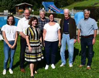 Lisann Pommerenke vom Fachbereich 3 der Verwaltung, Erster Beigeordneter Torsten Loosen, Bürgermeisterin Maren Busch, Peter Fleck vom Bauhof, Pächterin Kirsten Darda mit ihrem Vater und Dieter Hörle vom Förderverein „Freibad Birlenbach in der Verbandsgemeinde Diez e.V.“