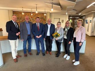 von links nach rechts: MdL Matthias Lammert, Erster Beigeordneter Torsten Loosen, Landrat Jörg Denninghoff, Berthold, Waltraud und Carmen Mehlen sowie Ortsbürgermeisterin Petra Saß