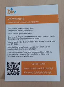 Bislang wurden „Scheibenwischerverwarnungen“ in Form eines standardisierten blauen DIN A6-Zettels erteilt – alles Weitere kam per Post. Seit letztem Monat verwendet das Ordnungsamt der Verbandsgemeinde Diez neue Benachrichtigungskarten mit einem QR-Code. Dadurch erhält jedes Knöllchen eine eindeutige individuelle Kennung, sie steht auch im Klartext auf der Benachrichtigungskarte für eine händische Eingabe am PC. Auf diese Weise gelangt man zum neuen „Online-Knöllchen“-Internetportal (www.knoellchen-info.de), dort kann die Verwarnung am Bildschirm genauer angesehen werden: was genau wird vorgeworfen, wann und wo soll das gewesen sein, wie hoch ist das Verwarn- oder Bußgeld?