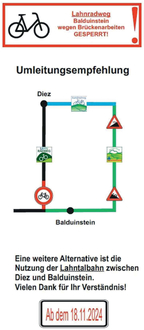 Der Landesbetrieb Mobilität Diez teilt mit, dass die Arbeiten auf der Lahnseite Balduinstein mittlerweile soweit fortgeschritten sind, dass in kürze die Arbeiten auf der Seite Langenscheid beginnen werden. Hierzu ist nun die erste Vollsperrung des Lahnradweges unumgänglich. Geplanter Beginn der Vollsperrung des Lahnradweges ist der 18.11.2024, die Sperrung dauert bis vermutlich Ende Februar 2025.