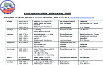 | donnerstags | 17.30 - 19.00 h 18.00 - 20.00 h | Frauen, Männer, Jugend, U 20-18 (Jg. 2006 und älter) 1. 3. 5. Do. Bahntraining 2. u. 4. Do. Bahn- u. Hallentraining | Zentrale Sportanlage Diez | Lutz Preußner/Jörg Rammner |