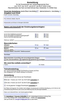 Eine Anmeldung ist bis zum 15.03.2024 möglich. Das Anmeldeformular können Sie im Verwaltungsgebäude der Verbandsgemeinde Diez, Louise-Seher-Straße 1, 65582 Diez, bei Frau Wengenroth erhalten oder unter www.vgdiez.de/ferien24 herunterladen.