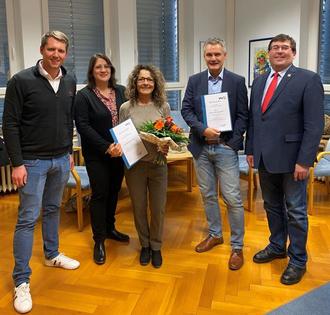 v.l. 1. Beigeordneter Marcel Willig, KVHS-Leiterin Katharina Kunz, Martina Welter, Klaus Föhrenbacher, Landrat Jörg Denninghoff