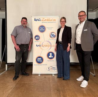 Bürgermeister Lars Denninghoff (VG Aar-Einrich, links) und Christopher Kahl (Entwicklungsagentur Aar-Einrich) freuten sich über den Impulsvortrag der Expertin und Referentin Helen Worm (webfacemedia GmbH, Bildmitte) zum Thema „Künstliche Intelligenz“.