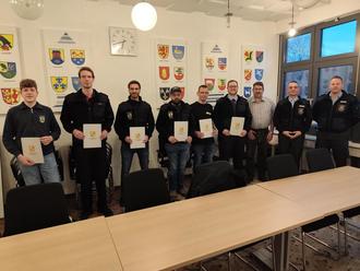 Im Rahmen der letzten Wehrführer-Dienstbesprechung am 21. März 2025 wurden folgende Feuerwehrangehörige von Bürgermeister Lars Denninghoff im Beisein der Wehrleitung in den aktiven Feuerwehrdienst verpflichtet: Christian Ober und Simon Schütz (FFW Eisighofen), Julian Laux (FFW Gutenacker), Jannis Emil Obel und Jakob Pfeiffer (FFW Hahnstätten) sowie Christoph Michael Steinheimer (FFW Roth). Zuvor wurden sie über ihre Dienstpflichten als ehrenamtliche Feuerwehrangehörige belehrt und auf die Folgen der Nichtbeachtung hingewiesen. Nicht auf dem Bild sind Feuerwehrangehörigen Luca Fabian Köstler und Marc-Leon Krassler aus der Einheit Katzenelnbogen, die bereits einen Tag zuvor in den aktiven Feuerwehrdienst verpflichtet wurden.
