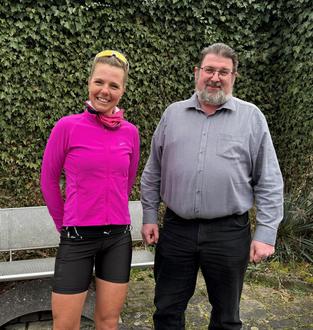 Lars Denninghoff gratulierte der Ultraläuferin Joyce Hübner, die im Rahmen ihres 286. Marathons in der Stadt Katzenelnbogen zu Gast war.