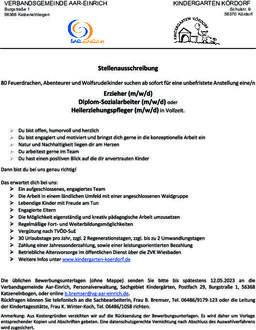 Die üblichen Bewerbungsunterlagen (ohne Mappe) senden Sie bitte bis spätestens 12.05.2023 an die Verbandsgemeinde Aar-Einrich, Personalverwaltung, Sachgebiet Kindergärten, Postfach 29, Burgstraße 1, 56368 Katzenelnbogen, oder online b.bremser@vg-aar-einrich.de.
