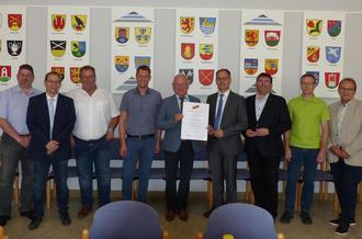 v.l. Beigeordneter und Harald Gemmers Nachfolger im Amt Lars Denninghoff, die Büroleiter Stefan Nickel und Thomas Biebricher, 1. Beigeordneter Marcel Willig, Bürgermeister Harald Gemmer, der 1. Vorsitzende der Kreisgruppe Rhein-Lahn Jens Güllering, SPD-Fraktionsvorsitzender Jörg Denninghoff, CDU-Fraktionsvorsitzender Alexander Lorch, Personalratsvorsitzender Uwe Welker