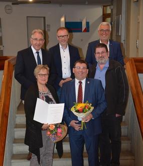 h.R.v.l. Landtagsabgeordneter Matthias Lammert, Ortsbürgermeister Jörg Schramm, Landtagsabgeordneter Roger Lewentz v.R.v.l. die Geehrte Simone Klockhaus-Reich, Landrat Jörg Denninghoff, Bürgermeister Lars Denninghoff.