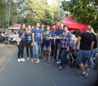 Ein Foto aus dem Jahr 2019 zeigt fröhliche Gäste vor dem Weinstand des Deutsch-Französischen Freundeskreises