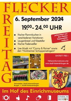 Nach drei gelungenen Veranstaltungen findet der vierte „Flecker Freitag“ für das Jahr 2024 am Freitag, den 6. September von 19 Uhr bis 24 Uhr im Hof des Einrichmuseums statt - mittlerweile ein fester Bestandteil im Veranstaltungskalender. Die Besucher erwartet ein geselliger Abend im einmaligen Ambiente des Innenhofs. Für Speisen und Getränke sorgt an dem Abend wieder das Team der „Flecker Fassenachtsweiber“ mit warmen und kalten Speisen und Getränken - von frischen Flammkuchen in verschiedenen Variationen über Laugengebäck und Käseteller bis zur Weinauswahl und frischem Federweißen. Auch für die musikalische Unterhaltung wird an diesem Abend wieder mit Live-Musik gesorgt. Zu Gast sind „Conny & Rainer“ sowie die Holzheimer Schoppensänger, die gemeinsam zur Unterhaltung von Jung und Alt beitragen.