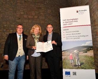 Verleihung der Urkunde an die Regio Lahn-Taunus. v.l.n.r.: Andy Becht, Sabine Ksoll, Michael Schnatz