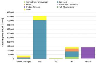 Der Energieverbrauch und der CO2-Austoß wird in verschiede Sektoren aufgeteilt und nach Energieträger aufgeschlüsselt. Hauptverbraucher ist die Industrie, gefolgt vom Verkehr, Haushalten, GHD und den kommunalen Einrichtungen. Insgesamt beträgt der Endenergieverbrauch 824.900 MWh. Der Ausstoß der verschieden Treibhausgase wird in CO2-Equivaltente angegeben und beträgt 229.800 t CO2e/a. Die Bilanz ist für das Jahr 2019 erfolgt, da es einige Zeit dauert bis alle Daten geprüft und bereitgestellt werden. Ebenfalls ist zu beachten, dass die Corona-Pandemie und der russische Angriffskrieg auf die Ukraine, den Energieverbrauch und damit auch den Treibhausgasausstoß ab dem Bilanzjahr 2020 stark beeinflussen.