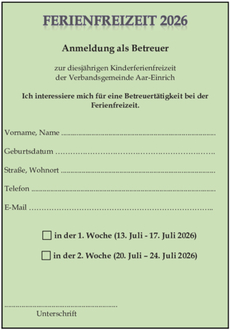 Wenn Sie Spaß daran haben, als Betreuer an der Ferienfreizeit mitzuwirken, können Sie sich mit dem abgedruckten Formular bei uns anmelden. Dieses Formular finden Sie auf unserer Homepage. Das Mindestalter für die Ausübung einer Tätigkeit als Betreuer beträgt 14 Jahre.