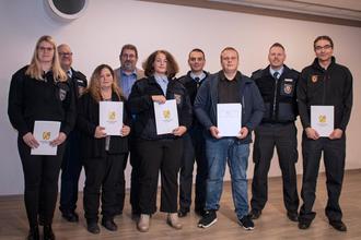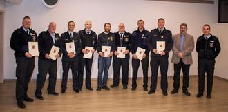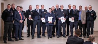 Das bronzene Feuerwehrehrenzeichen für 15 jährige aktive Tätigkeit erhielten: Martin Christian Schnee (FFW Burgschwalbach), Nils Heiber (FFW Hahnstätten), Klaus Rasbach und Sascha Winn (FFW Herold), Dominik Richter (FFW Katzenelnbogen), Lukas Egert und Carsten Stroh (FFW Mittelfischbach), Tatjana Matthey, John-Paul Marco Helbig, John Dominik Mohr und Sebastian Schwenk (FFW Niederneisen).