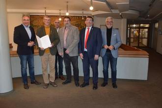 v.l.. Landtagsabgeordneter Matthias Lammert, der Geehrte Rüdiger Klotz, Ortsbürgermeister Rainer Mohr, Bürgermeister Lars Denninghoff, Landrat Jörg Denninghoff, Landtagsabgeordneter Roger Lewentz