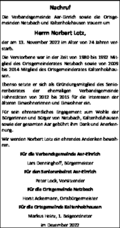 Die Verbandsgemeinde Aar-Einrich sowie die Ortsgemeinden Netzbach und Kaltenholzhausen trauern um
