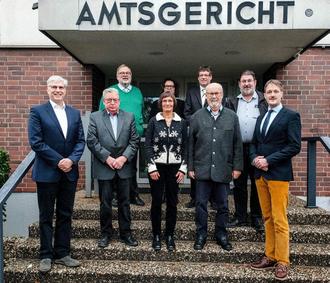 Vordere Reihe v.l. die scheidenden stellvertretenden Schiedsmänner Stefan Remaklus und Paul Erich Schmidt, die neue Schiedsfrau für den Schiedsamtsbezirk Hahnstätten Elke Zeidler-Taesler, der scheidende Schiedsmann Manfred Ehrecke sowie der Direktor des Amtsgerichts Diez Dennis Graf Hintere Reihe v.l. Hans-Jürgen Gross vom Bund der Deutschen Schiedsmänner und Schiedsfrauen in der Bezirksvereinigung Koblenz, Justizamtsrätin Silvia Branz, Justizrechtsrat Norbert Baldus, Bürgermeister Lars Denninghoff
