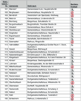 gekennzeichnet sind, wurden die Wahlräume zur Erleichterung der Teilnahme an der Wahl für behinderte und andere Menschen mit Mobilitätseinschränkungen barrierefrei eingerichtet. Stimmberechtigte mit Mobilitätseinschränkungen, die nicht im Wählerverzeichnis eines barrierefreien Stimmbezirks eingetragen sind, können innerhalb ihres Wahlkreises mit einem Wahlschein in einem barrierefreien Wahlraum wählen.