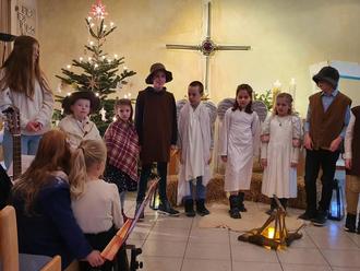 Rund 15 Jungscharkinder aus Friedland hatten mit Pfarrerin Yvonne Fischer und Team eifrig geübt: Einem Zeitungsleser wurden vom Erzengel Gabriel (hier war es Gabriela) die bekannten weihnachtlichen Szenen dargeboten, so kam dieser nach und nach dem Geheimnis der Menschwerdung Gottes auf die Spur.