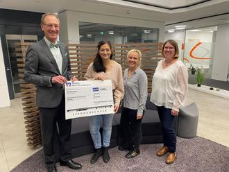Günter Groß (links) von der Volksbank Rhein-Lahn-Limburg überreichte der 1. Vorsitzenden des Fördervereins, Inga Zöge, sowie Doreen Eisenhut und Christina Occhipinti den symbolischen Scheck über 2.000 Euro. (Foto: Schillerschule)