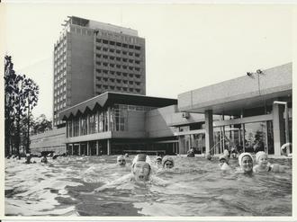 Außenbecken des Thermalbads mit dem Hotel im Hintergrund (Werbefoto der Mineralbad GmbH, 1973)