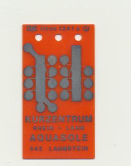 Die allererste Eintrittskarte für das Thermalbad, Kunststoff, gezogen von Kurdirektor Fritz Berlin am Automaten am 15.3.1973 (und dem Stadtarchiv zur Aufbewahrung geschenkt)