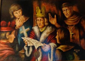 „Kaiser Ludwig der Bayer verleiht 1324 die Stadtrechte an Oberlahnstein“ (Ölgemälde von Willi Britschgi, Sammlung Stadtarchiv Lahnstein)