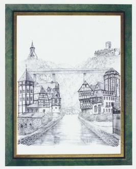 „Hochbrücke verbindet Sehenswürdigkeiten beiderseits der Lahn“ (Zeichnung von Willi Britschgi, Sammlung Stadtarchiv Lahnstein)