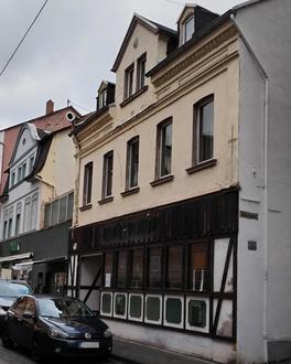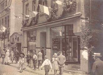 Auf dem Foto aus den 1920er Jahren befand sich darin das Café Arzheimer, geführt von Bäckermeister Franz Arzheimer (1868-1919) und seiner Frau Elisabeth, die es nach dem Tod des Ehemannes als Conditorei-Café weiterführte. Die Fähnchen wurden zu Festen wie Fronleichnam herausgehangen.