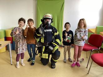 Feuerwehrmann und Brandschutzbeauftragter Sebastian Schmitt besuchte die Kita Rambazamba.