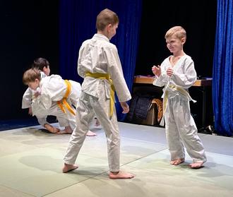 Vor den Ehrungen beeindruckten die jüngsten Judhighqas des VfL Paul, Theo, Benjamin und Andrej das Publikum mit ihrer Geschicklichkeit und Kraft im Zweikampf.