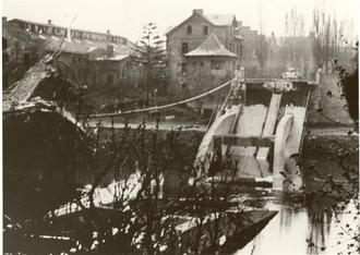 Ein Panzer steht am 27. März 1945 auf Oberlahnsteiner Seite der durch die Wehrmacht gesprengten Lahnbrücke. (Foto: Sammlung Stadtarchiv Lahnstein)