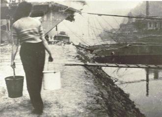 Eine Einwohnerin versorgt sich mit Wasser. Im Hintergrund die im März 1945 gesprengte Lahnbrücke. (Foto: Emil Simonis / Sammlung Stadtarchiv Lahnstein)
