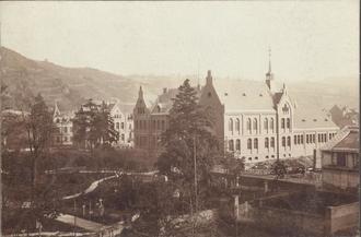 um 1900: Foto des Schillerpark als Friedhof, im Hintergrund die Gymnasialstraße mit dem 1896 erbauten Gymnasium (heute Förderschule)