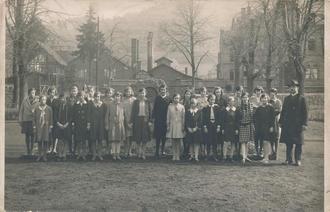 Jahrgang 1917/18 (Mädchen) platziert sich mit Lehrer im Jahr 1931 vor dem Schillerstein. Dieser wurde später innerhalb des Parks versetzt. Im Hintergrund erkennt man die Wilhelmstraße mit Gaswerk und Gesellenhaus (hinten rechts). (Fotos: Sammlung Stadtarchiv Lahnstein)
