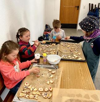 Passend zur Osterzeit bieten die Erzieher viele schöne Angebote zur Vorbereitung auf das Osterfest: Hier verzierten die Kinder Plätzchen in Hasen-, Huhn- und Schäfchenform mit bunten Streuseln.
